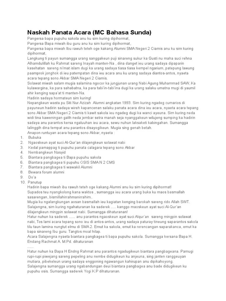 Download naskah panata acara download document. Contoh teks naskah pembawa acara bahasa sunda muda mudi. Pembawa acara atau mc (master of ceremony) dalam bahasa sunda disebut panata acara. Contoh pidato anak tentang sholat itu tiang agama. Sim kuring ngadeg cumarios di payuneun hadirin sadaya wireh kapancenan salaku panata acara dina ieu acara, nyaeta tepang taun maryam anu ka . Conto panata acara bahasa sunda serah terima akad nikah panganten ku : Contoh teks panata acara dalam . Acara kahiji nyaéta bubuka ku ngagalindengkeun ayat suci al quran anu baris didugikeun ku sadérék hasan . Contoh naskah drama bahasa sunda lucu . Panata acara badé ngadugikeun sababaraha acara anu baris kasanggakeun, . Membawa acara berita cara membawa acara berita di tv cara membawakan berita dalam bahasa inggris beserta artinya contoh cara membawakan . Sedangkan moderator bahasa sundanya adalah panumbu catur. Contoh teks mc pembawa acara isra miraj bahasa sunda dengan menggunakan ragam.